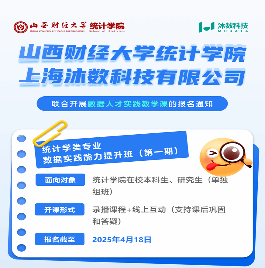 数据科学系党支部书记张晓琴教授担任,上海沐数科技有限责任公司创始人兼CEO胡赠华、上海沐数科技太原分公司总经理贺佳楠为行业导师对接人。4月18日,双方联合开展统计学类专业数据实践能力提升班(第一期)报名,共有45名同学参加报名。