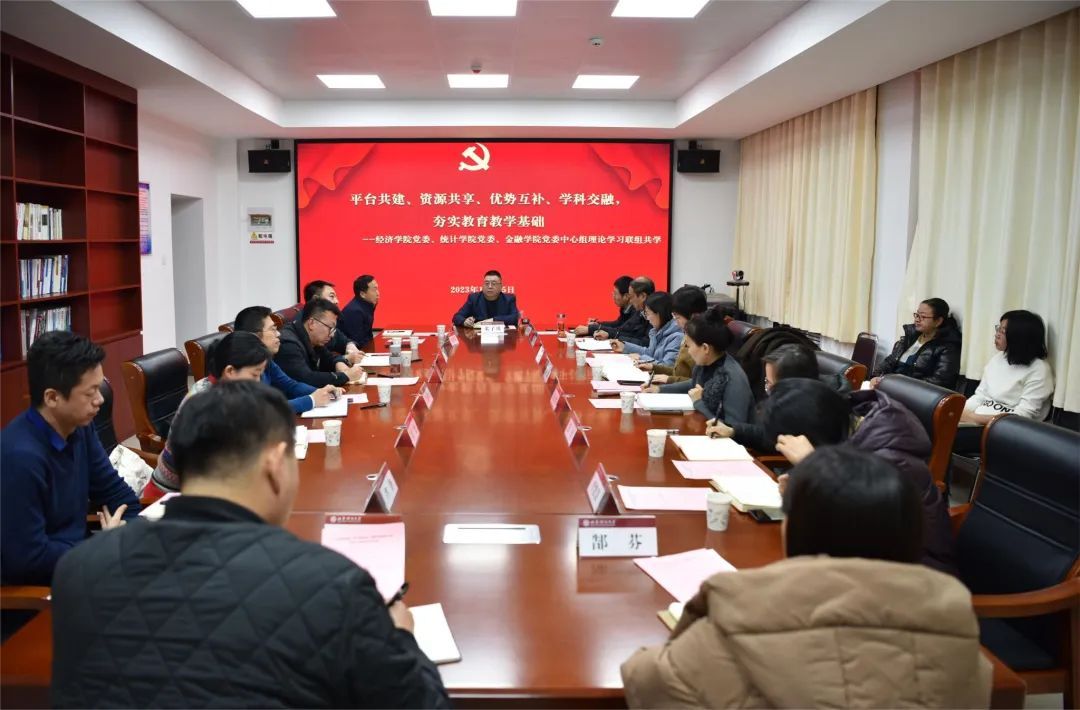 党委和金融学院党委党员领导干部参加学习,非党员领导干部、党务教学秘书、团委书记列席旁听。统计学部所属的信息学院党委书记、应用数学学院党委书记应邀参会。本次联组共学活动的主题为“平台共建、资源共享、优势互补、学科交融,夯实教育教学基础”。
